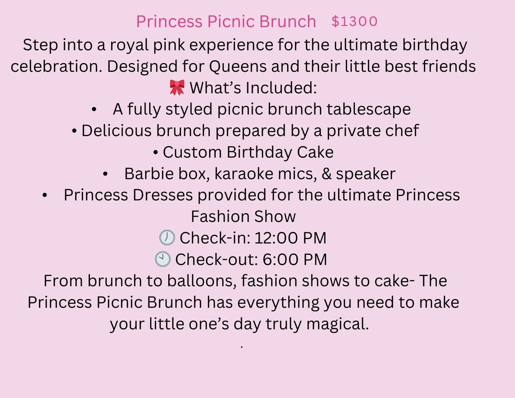 Tired Of Looking For An Airbnb That Allows Parties And Provides Everything You Need For The Perfect Night? Our Packages Start Off At Only $1000 50% DUE AT TIME OF BOOKING IS NON-REFUNDABLE THERE IS A $300 REFUNDABLE SECURITY DEPOSIT DUE 24 HOURS BEFORE CHECK IN NO SMOKING, HOOKAH, OR VAPING ALLOWED BOOK NOW LIMITED SPOTS!!! LIMITED SPOTS!!! LIMITED SPOTS!!! Princess Picnic Brunch BOOK NOW For Our Big Mama Inquire Below BOOK NOW